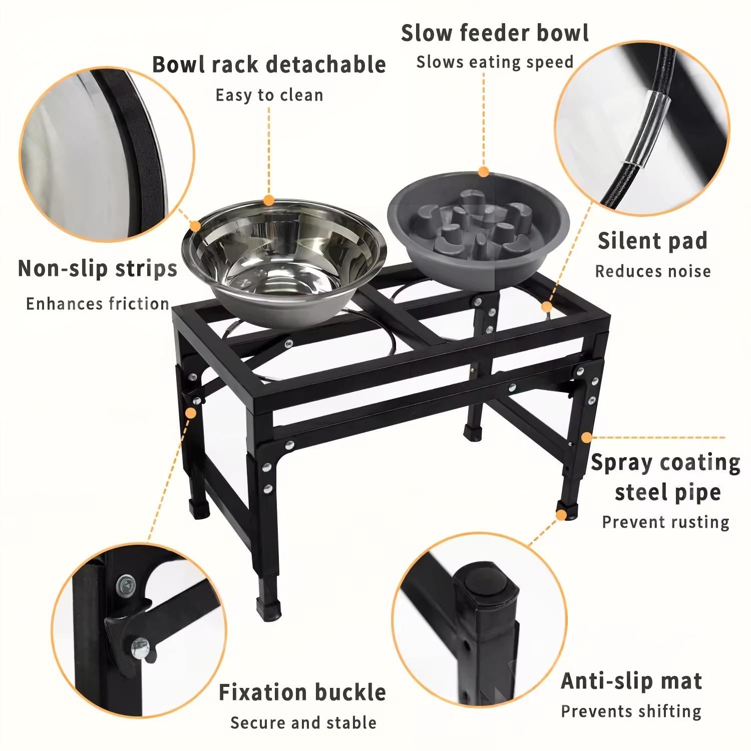 Designed with your pet's health and comfort in mind, this innovative stand features dual stainless steel bowls and a slow-feed design to help regulate your pet's eating speed and promote better digestion. The adjustable height feature ensures that your pet can feed comfortably at the perfect height, reducing neck strain and promoting better posture.