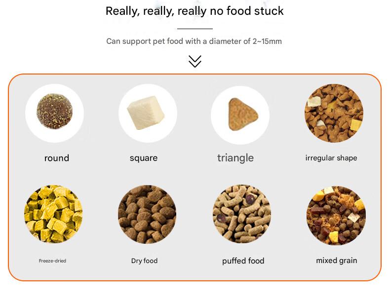 Supports kibble sizes 2–15mm, including round, triangular, irregular shapes, and freeze-dried food. Anti-jam outlet ensures smooth dispensing.