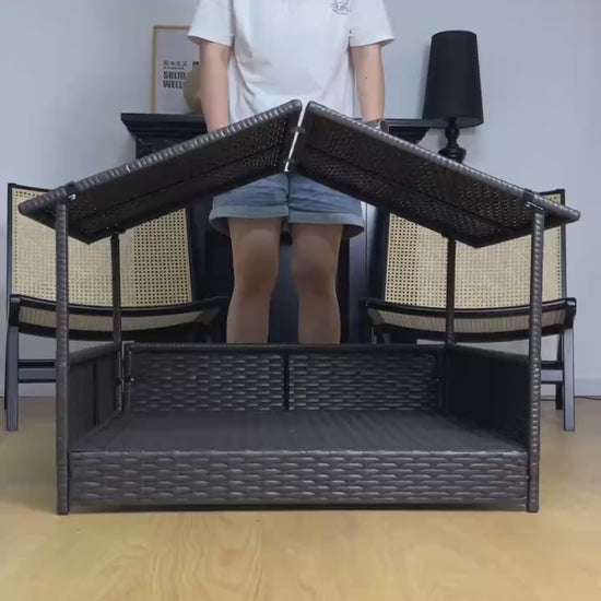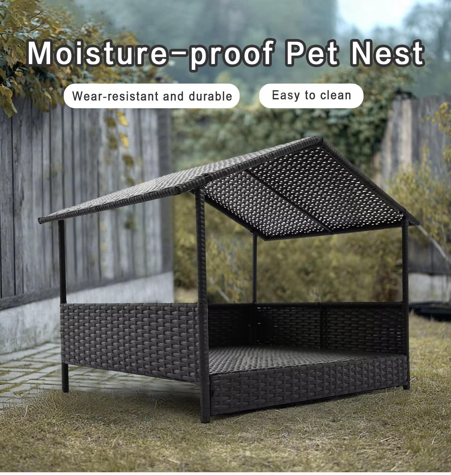 This dog house features a raised base to keep your pet dry and away from dirt and insects. With its removable roof, it ensures your pet stays cool in the summer and protected from rain when needed. The PE rattan fabric is breathable, non-toxic, and easy to clean, making it safe and comfortable for your dog to sleep and play in.